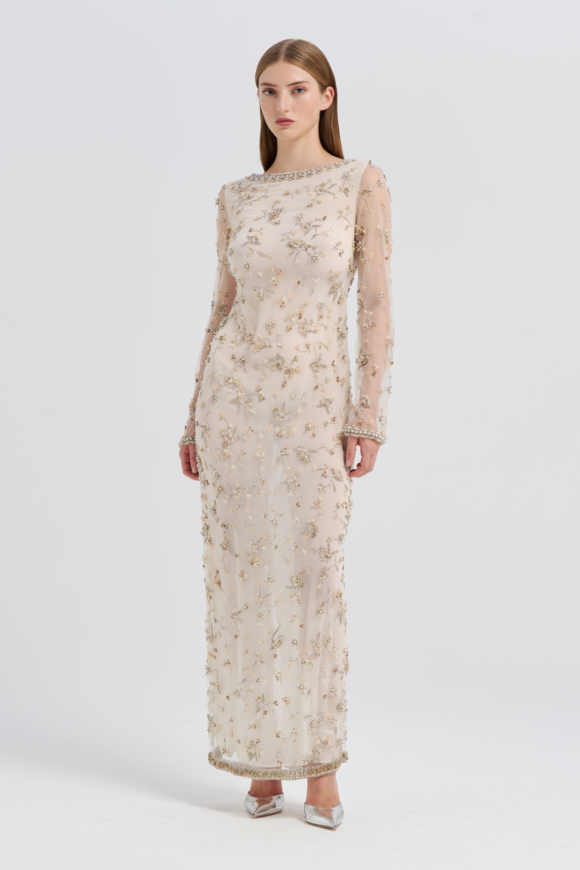 Embroidered Long Dress. Hand-crafted detailing, elegant silhouette, and zip closure at the back.