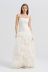 White silk bodice, thin straps, straight neckline and zip closure at the back. The skirt is adorned with tone-on-tone feathers.
